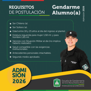 La Escuela de Gendarmería de Chile está desarrollando el Proceso de Admisión 2026, para Gendarmes Alumnos y Alumnas. Los interesados pueden postular hasta el 29 de septiembre.