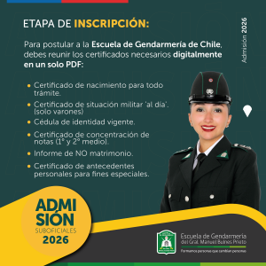Dentro de los requisitos para postular se encuentran: ser chileno (a), ser soltero (a), estatura mínima mujeres 1.58 metros y hombres 1.65 metros, edad entre 18 y 25 años al día del ingreso al plantel, hombres con situación militar al día (no implica haberlo realizado).